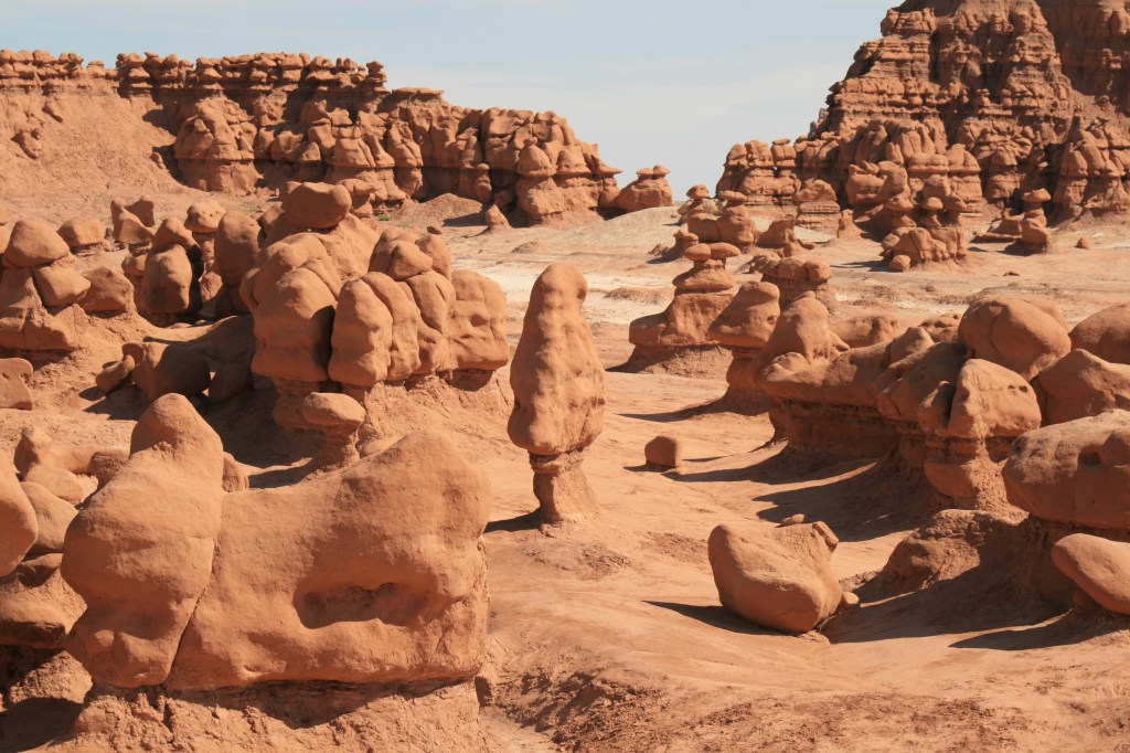 We rijden dus gewoon door naar het staatsparkje Goblin Valley en daar aangekomen, zien we de meest vreemde rotsvormsels. Een beter woord kan ik niet bedenken. Soms staat zo’n vormsel alleen en lijkt het op een paddestoel, soms staan ze in een groepje bijeen en zijn het net figuurtjes uit een sprookje of uit de smurfen! Heel apart. We lopen wat rond in de snikhitte, voordat we op weg gaan naar Capitol Reef NP.