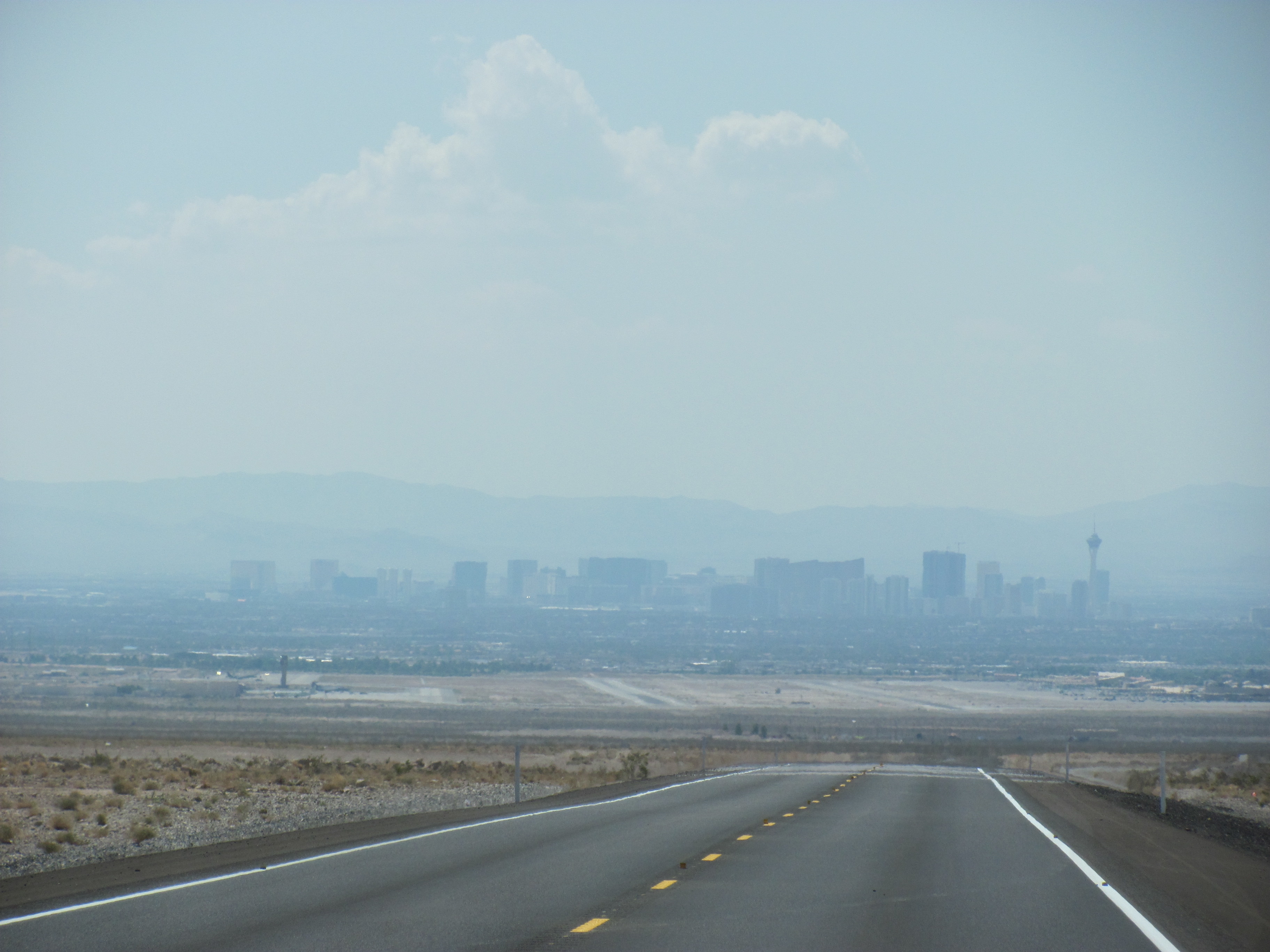 Na een paar uur zien we de skyline van Las Vegas in zicht komen, maar via North Las Vegas worden we de US95 opgestuurd. We stoppen bij een Starbucks voor een frappuccino, want het is heet hier. Zo’n 104 graden Fahrenheit, dus een koel drankje gaat er wel in.