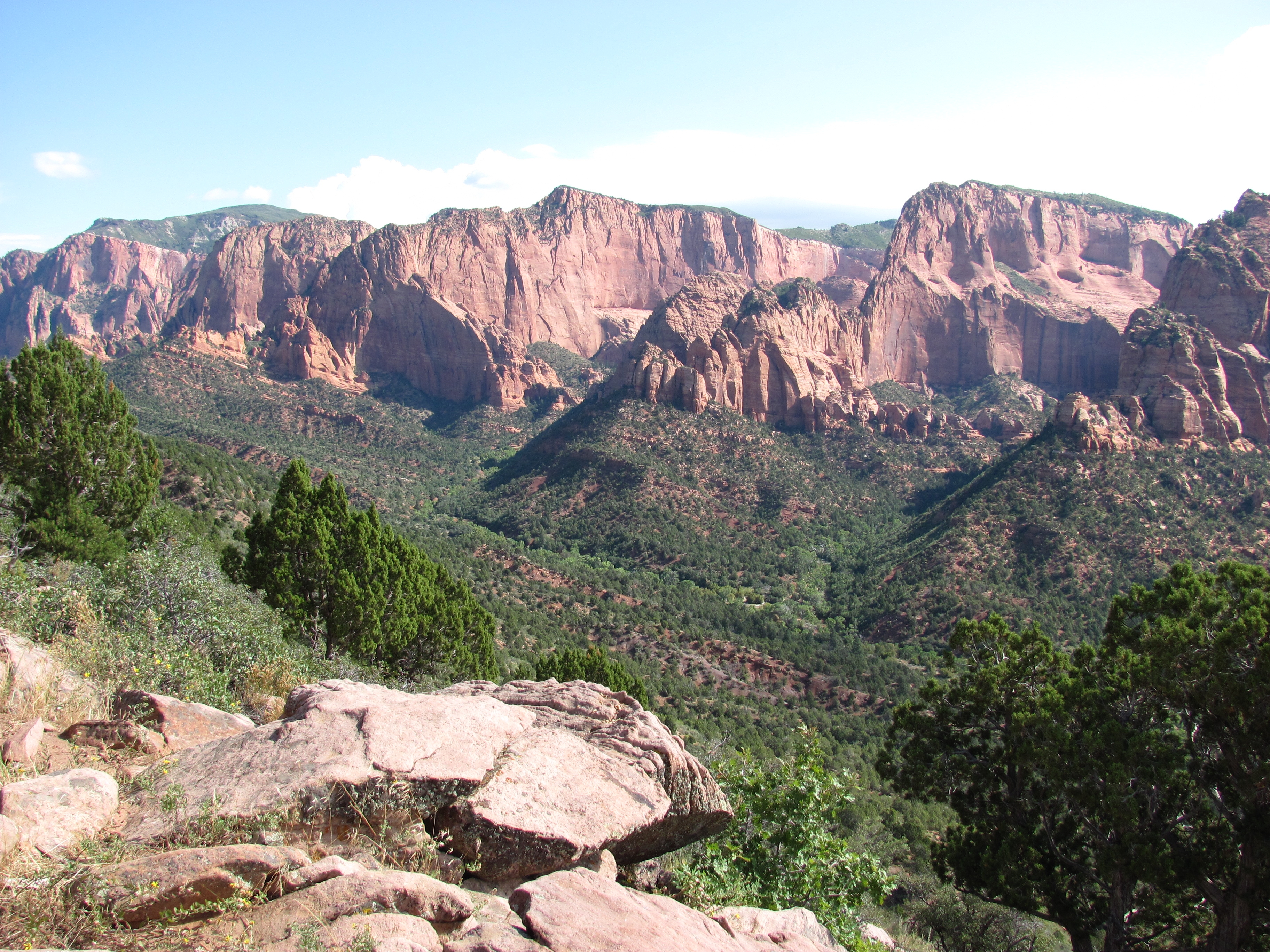 Na een paar mijl zien we de afslag naar Kolob Canyon, de achtertuin van Zion National Park. Hier zijn we vorig jaar ook geweest, maar toen hing alles in de rook, door een brand mijlenver weg. Monique vindt dat ze geen mooie foto’s heeft van die dag en kijkt mij smekend aan. Ook ik wil mooie foto’s van dit stukje, dus ik sla af, spring uit de auto bij het Visitor center om mijn pas te laten scannen en dan rijden we de 5.4 mijl naar het einde van de weg.