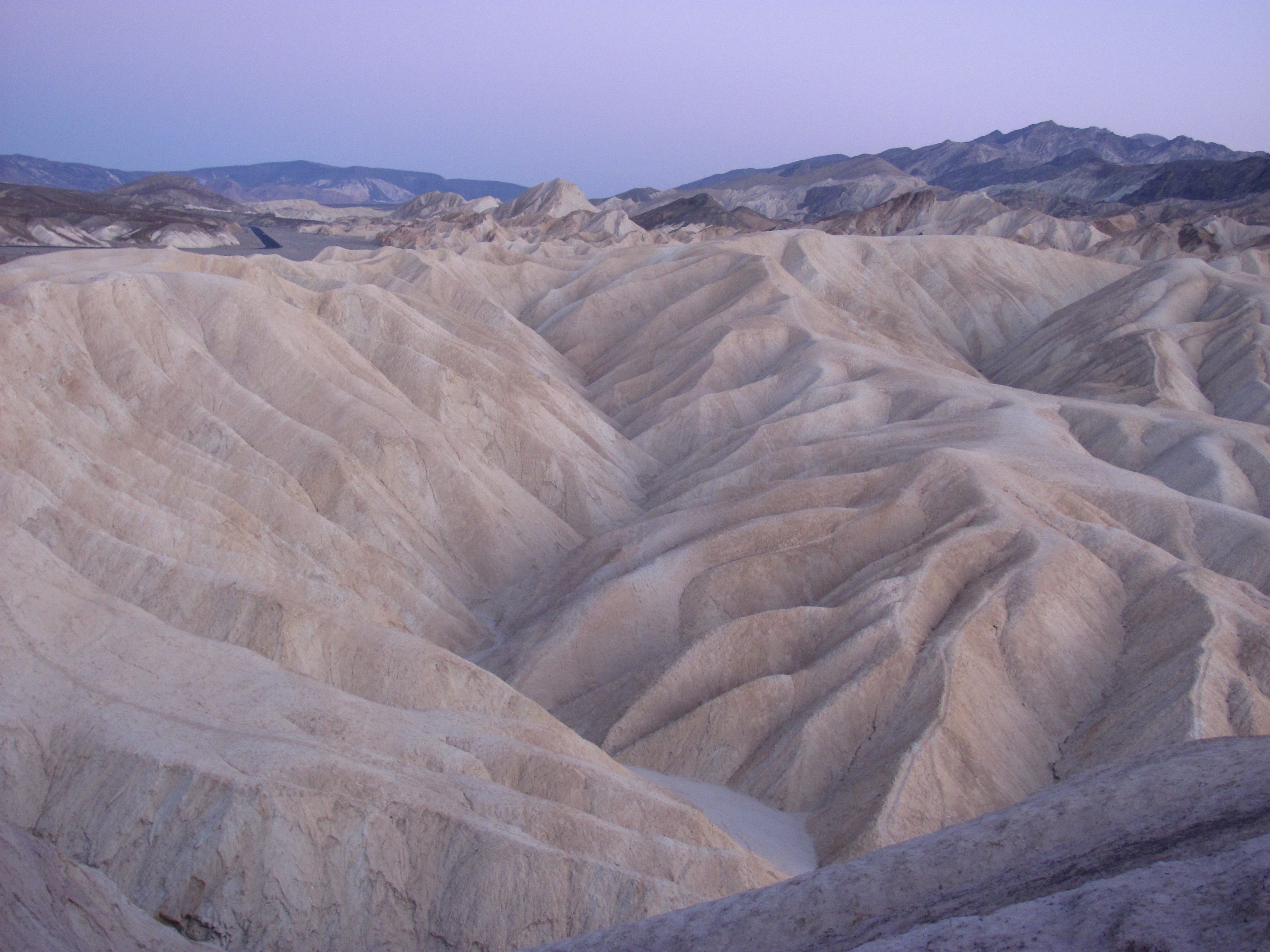 Bij het inchecken ziet Monique dat het hier 108 graden Fahrenheit is! Heet dus! Onze cabin van dit jaar ligt aan de overkant van waar we vorige keer zaten en de cabins zijn enigszins verbeterd. Nieuwe bedden (nooit verkeerd), nieuwe dekbedden (ook niet verkeerd) en ik zie dat we 2 airco’s hebben. Die heb je wel nodig nodig hier! We relaxen wat en gaan bijtijds een hapje eten. Daarna sjeezen we naar Zabriskie Point voor hopelijk een mooie zonsondergang. Iets te laat komen we daar aan, maar het licht blijft mooi!