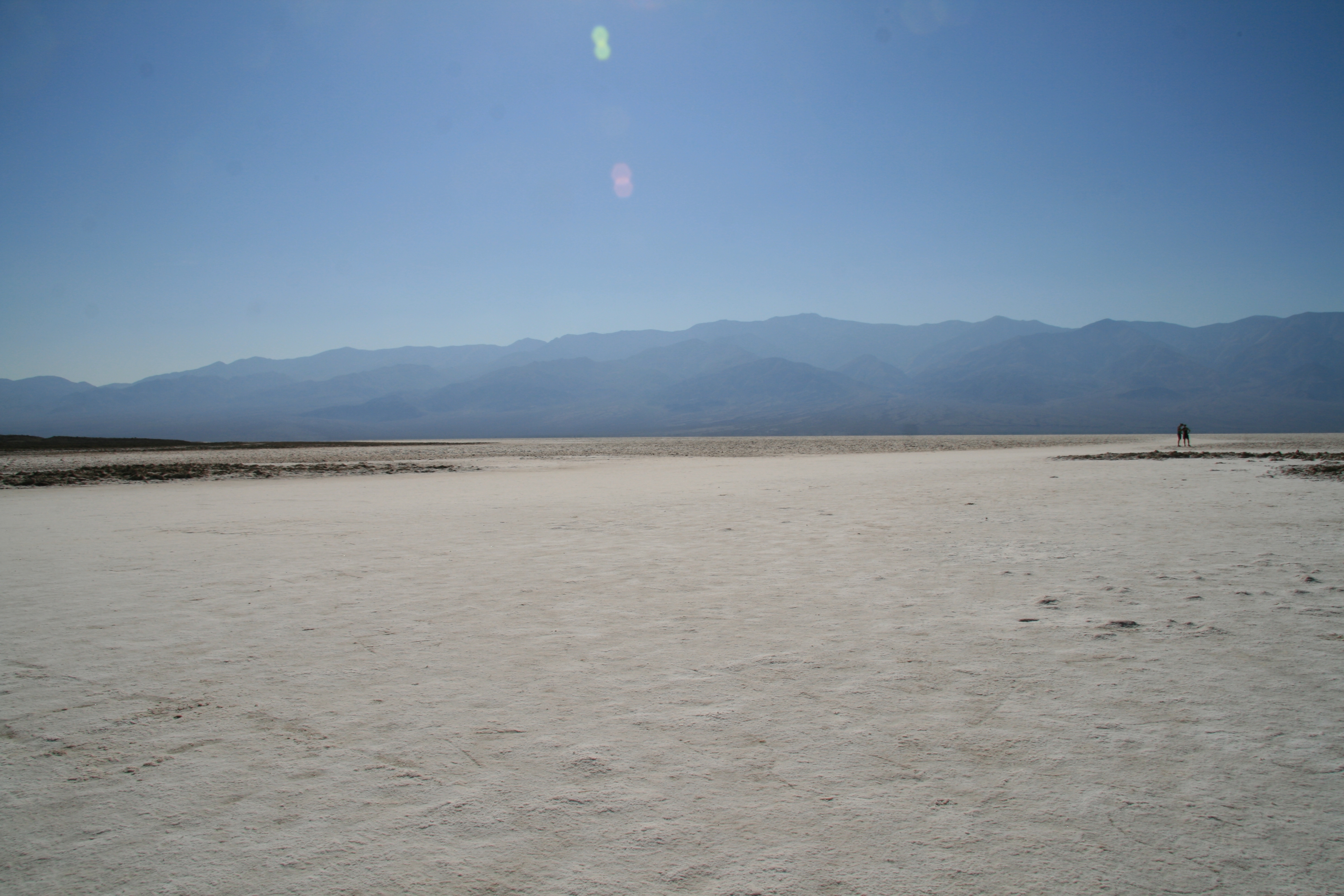 Dan komen we bij Badwater en het is hier snik- en snikheet… Niet leuk meer. Toch lopen we naar de zoutvlakte, waar we even rondkijken, maar dan leg ik zowat het loodje en besluit snel terug te gaan naar de auto!